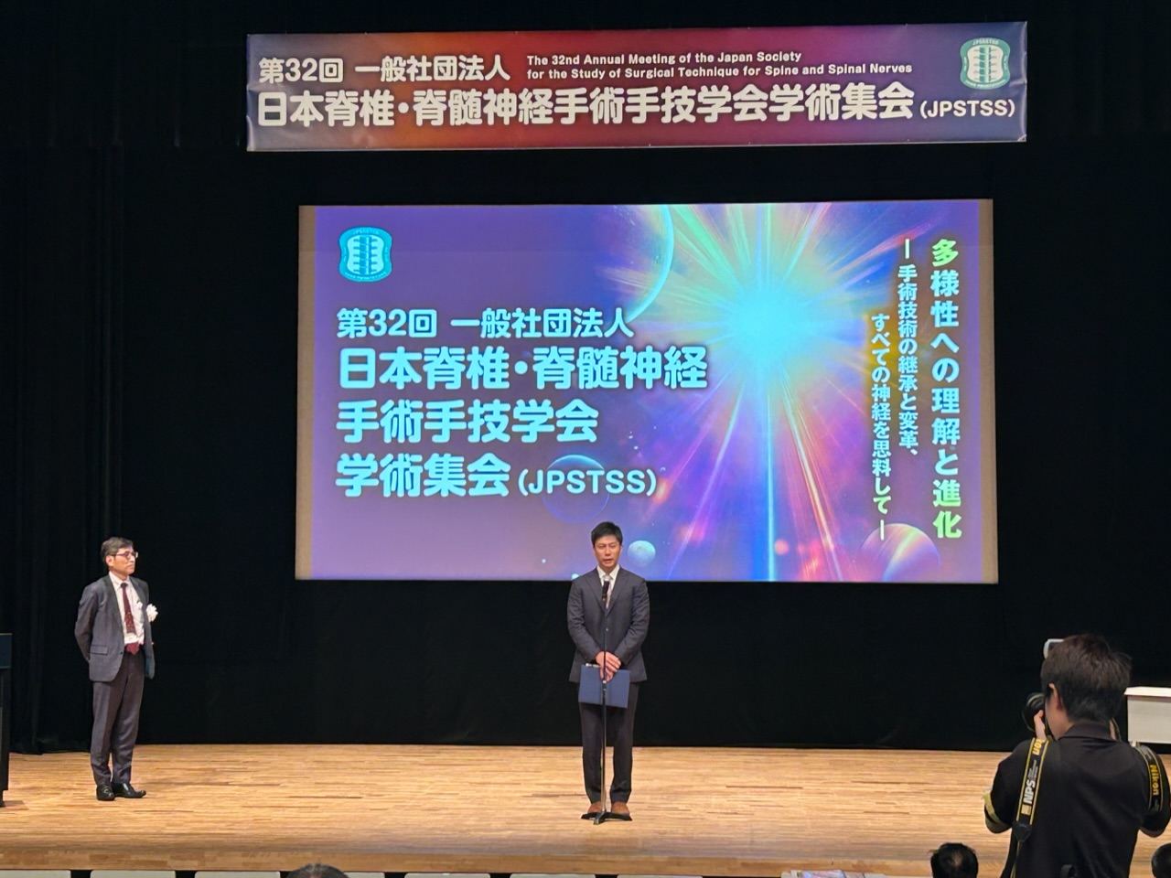 この度、2025年9月にウインク愛知で開催されました第32回日本脊椎・脊髄神経手術手技学会で、「びまん性特発性骨増殖症の脊椎骨折に対するPES法を用いた後方固定術の術後矯正損失の特徴」がBest Presentation Awardを頂きました。平素よりご指導賜っております諸先生方に厚く御礼申し上げます。今後ともよろしくお願い申し上げます。