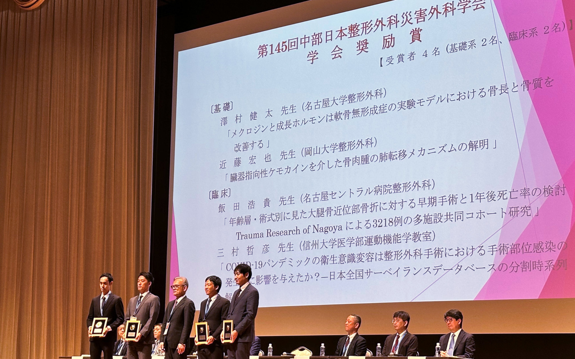 このたび、第145回中部日本整形外科災害外科学会において「メクロジンと成長ホルモンは軟骨無形成症の実験モデルにおける骨長と骨質を改善する」というテーマで、学会奨励賞を受賞いたしました。大学での研究をこのように評価いただき、大変光栄に存じますとともに、これまでご指導を賜りました先生方に心より感謝申し上げます。今回の受賞を励みに、今後も研究活動に邁進してまいります。